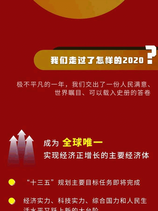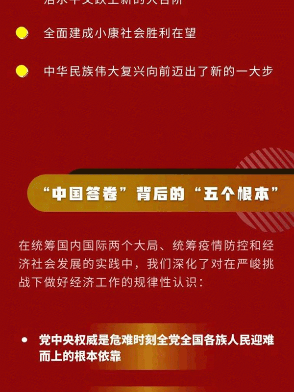 會(huì)議認(rèn)為,今年是新中國(guó)歷史上極不平凡的一年。面對(duì)嚴(yán)峻復(fù)雜的國(guó)際形勢(shì)、艱巨繁重的國(guó)內(nèi)改革發(fā)展穩(wěn)定任務(wù)特別是新冠肺炎疫情的嚴(yán)重沖擊,我們保持戰(zhàn)略定力,準(zhǔn)確判斷形勢(shì),精心謀劃部署,果斷采取行動(dòng),付出艱苦努力,交出了一份人民滿(mǎn)意、世界矚目、可以載入史冊(cè)的答卷。我國(guó)成為全球唯一實(shí)現(xiàn)經(jīng)濟(jì)正增長(zhǎng)的主要經(jīng)濟(jì)體,三大攻堅(jiān)戰(zhàn)取得決定性成就,科技創(chuàng)新取得重大進(jìn)展,改革開(kāi)放實(shí)現(xiàn)重要突破,民生得到有力保障。這些成績(jī)來(lái)之不易,歷經(jīng)艱難險(xiǎn)阻,是以習(xí)近平同志為核心的黨中央堅(jiān)強(qiáng)領(lǐng)導(dǎo)的結(jié)果,是全黨全軍全國(guó)各族人民團(tuán)結(jié)奮戰(zhàn)的結(jié)果。