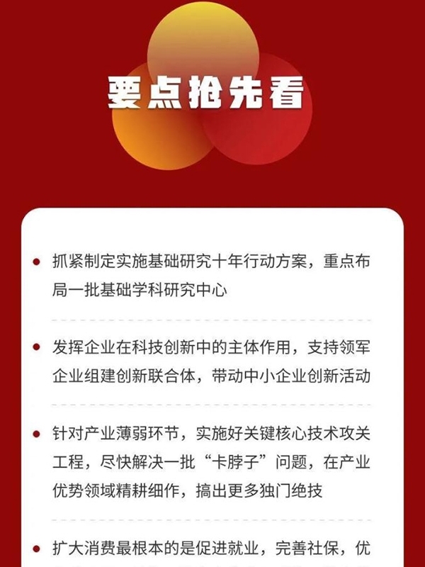 一是強(qiáng)化國(guó)家戰(zhàn)略科技力量。要充分發(fā)揮國(guó)家作為重大科技創(chuàng)新組織者的作用,堅(jiān)持戰(zhàn)略性需求導(dǎo)向,確定科技創(chuàng)新方向和重點(diǎn),著力解決制約國(guó)家發(fā)展和安全的重大難題。要發(fā)揮新型舉國(guó)體制優(yōu)勢(shì),發(fā)揮好重要院所高校國(guó)家隊(duì)作用,推動(dòng)科研力量?jī)?yōu)化配置和資源共享。要抓緊制定實(shí)施基礎(chǔ)研究十年行動(dòng)方案,重點(diǎn)布局一批基礎(chǔ)學(xué)科研究中心,支持有條件的地方建設(shè)國(guó)際和區(qū)域科技創(chuàng)新中心。要發(fā)揮企業(yè)在科技創(chuàng)新中的主體作用,支持領(lǐng)軍企業(yè)組建創(chuàng)新聯(lián)合體,帶動(dòng)中小企業(yè)創(chuàng)新活動(dòng)。要加強(qiáng)國(guó)際科技交流合作。要加快國(guó)內(nèi)人才培養(yǎng),使更多青年優(yōu)秀人才脫穎而出。要完善激勵(lì)機(jī)制和科技評(píng)價(jià)機(jī)制,落實(shí)好攻關(guān)任務(wù)“揭榜掛帥”等機(jī)制。要規(guī)范科技倫理,樹(shù)立良好學(xué)風(fēng)和作風(fēng),引導(dǎo)科研人員專(zhuān)心致志、扎實(shí)進(jìn)取。