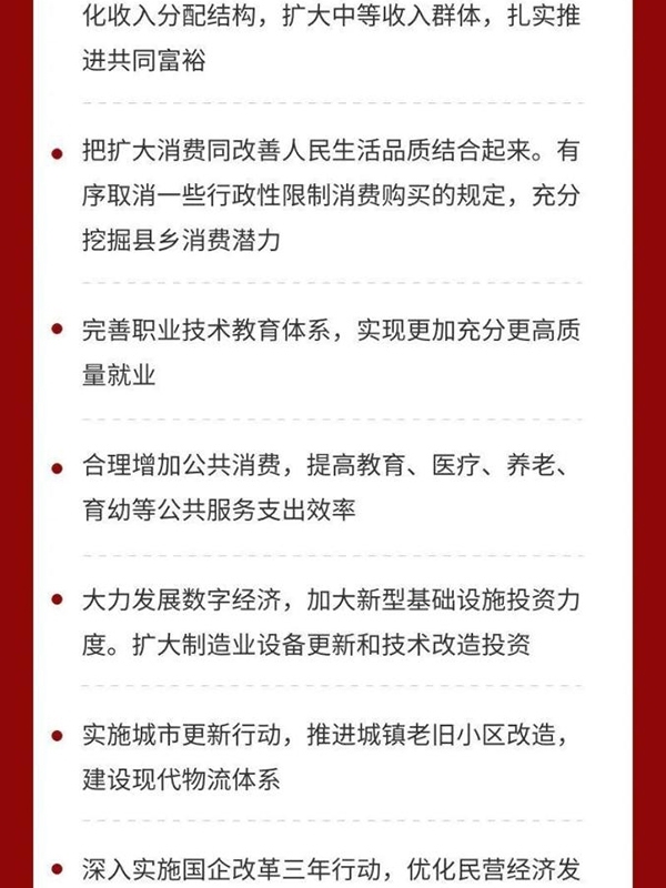 三是堅(jiān)持?jǐn)U大內(nèi)需這個(gè)戰(zhàn)略基點(diǎn)。形成強(qiáng)大國(guó)內(nèi)市場(chǎng)是構(gòu)建新發(fā)展格局的重要支撐,必須在合理引導(dǎo)消費(fèi)、儲(chǔ)蓄、投資等方面進(jìn)行有效制度安排。擴(kuò)大消費(fèi)最根本的是促進(jìn)就業(yè),完善社保,優(yōu)化收入分配結(jié)構(gòu),擴(kuò)大中等收入群體,扎實(shí)推進(jìn)共同富裕。要把擴(kuò)大消費(fèi)同改善人民生活品質(zhì)結(jié)合起來(lái)。有序取消一些行政性限制消費(fèi)購(gòu)買(mǎi)的規(guī)定,充分挖掘縣鄉(xiāng)消費(fèi)潛力。要完善職業(yè)技術(shù)教育體系,實(shí)現(xiàn)更加充分更高質(zhì)量就業(yè)。要合理增加公共消費(fèi),提高教育、醫(yī)療、養(yǎng)老、育幼等公共服務(wù)支出效率。要增強(qiáng)投資增長(zhǎng)后勁,繼續(xù)發(fā)揮關(guān)鍵作用。要發(fā)揮中央預(yù)算內(nèi)投資在外溢性強(qiáng)、社會(huì)效益高領(lǐng)域的引導(dǎo)和撬動(dòng)作用。激發(fā)全社會(huì)投資活力。要大力發(fā)展數(shù)字經(jīng)濟(jì),加大新型基礎(chǔ)設(shè)施投資力度。要擴(kuò)大制造業(yè)設(shè)備更新和技術(shù)改造投資。要實(shí)施城市更新行動(dòng),推進(jìn)城鎮(zhèn)老舊小區(qū)改造,建設(shè)現(xiàn)代物流體系。要加強(qiáng)統(tǒng)一規(guī)劃和宏觀指導(dǎo),統(tǒng)籌好產(chǎn)業(yè)布局,避免新興產(chǎn)業(yè)重復(fù)建設(shè)。