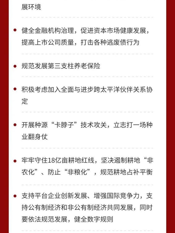 四是全面推進(jìn)改革開(kāi)放。構(gòu)建新發(fā)展格局,必須構(gòu)建高水平社會(huì)主義市場(chǎng)經(jīng)濟(jì)體制,實(shí)行高水平對(duì)外開(kāi)放,推動(dòng)改革和開(kāi)放相互促進(jìn)。要完善宏觀經(jīng)濟(jì)治理,加強(qiáng)國(guó)際宏觀政策協(xié)調(diào)。要深入實(shí)施國(guó)企改革三年行動(dòng),優(yōu)化民營(yíng)經(jīng)濟(jì)發(fā)展環(huán)境,健全現(xiàn)代企業(yè)制度,完善公司治理,激發(fā)各類(lèi)市場(chǎng)主體活力。要放寬市場(chǎng)準(zhǔn)入,促進(jìn)公平競(jìng)爭(zhēng),保護(hù)知識(shí)產(chǎn)權(quán),建設(shè)統(tǒng)一大市場(chǎng),營(yíng)造市場(chǎng)化、法治化、國(guó)際化營(yíng)商環(huán)境。要健全金融機(jī)構(gòu)治理,促進(jìn)資本市場(chǎng)健康發(fā)展,提高上市公司質(zhì)量,打擊各種逃廢債行為。要規(guī)范發(fā)展第三支柱養(yǎng)老保險(xiǎn)。要積極考慮加入全面與進(jìn)步跨太平洋伙伴關(guān)系協(xié)定。要大力提升國(guó)內(nèi)監(jiān)管能力和水平,完善安全審查機(jī)制,重視運(yùn)用國(guó)際通行規(guī)則維護(hù)國(guó)家安全。