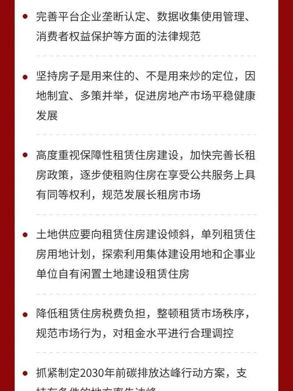 七是解決好大城市住房突出問(wèn)題。住房問(wèn)題關(guān)系民生福祉。要堅(jiān)持房子是用來(lái)住的、不是用來(lái)炒的定位,因地制宜、多策并舉,促進(jìn)房地產(chǎn)市場(chǎng)平穩(wěn)健康發(fā)展。要高度重視保障性租賃住房建設(shè),加快完善長(zhǎng)租房政策,逐步使租購(gòu)住房在享受公共服務(wù)上具有同等權(quán)利,規(guī)范發(fā)展長(zhǎng)租房市場(chǎng)。土地供應(yīng)要向租賃住房建設(shè)傾斜,單列租賃住房用地計(jì)劃,探索利用集體建設(shè)用地和企事業(yè)單位自有閑置土地建設(shè)租賃住房,國(guó)有和民營(yíng)企業(yè)都要發(fā)揮功能作用。要降低租賃住房稅費(fèi)負(fù)擔(dān),整頓租賃市場(chǎng)秩序,規(guī)范市場(chǎng)行為,對(duì)租金水平進(jìn)行合理調(diào)控。