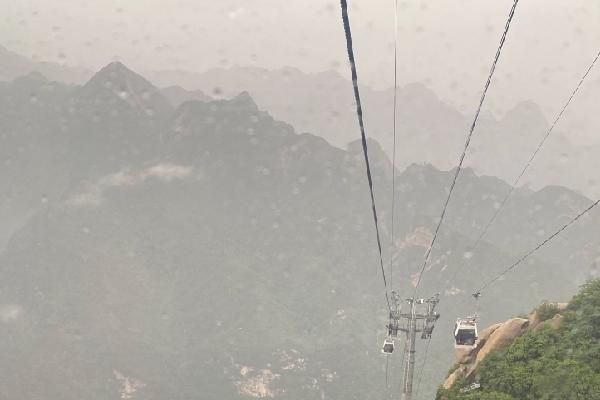 滑道后是西峰索道,因為雨水和霧氣,索道人員不斷的擦拭觀景玻璃。索道近20分鐘,纜車升高氣壓變化,耳朵有些耳鳴。隨著索道的升高,山盡收眼底,每個角度的都不一樣,透過玻璃和相機已無法拍出景色的美。山體像一塊垂直的峭壁,沒有任何起伏,因為接連下雨,雨水變成瀑布,和1989年發行的《華山》特種郵票一模一樣。“幽深足暮蟬,驚覺石床眠。瀑布五千仞,草堂瀑布邊。壇松涓滴露,岳月泬寥天。鶴過君須看,上頭應有仙。”