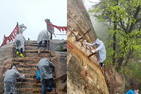 繼續上行到達華山青龍脊,紅色的飄帶與銅鎖在山中,隨著風雨飄蕩,云霧似雪,紅色的飄帶寓意愛情永存,愛人永不變心。