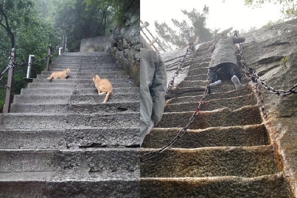 上至西峰處開始,要走階梯了,因為雨水,路面有些濕滑,路過三圣母廟,斧劈石,因沉香劈山救母傳說而得名。