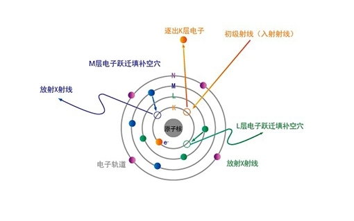如果要得到某元素的特征X射線,需要對元素原子內層電子進行激發,使得內層電子獲得一定能量,能夠脫離原子核的束縛,從而在內層軌道形成電子空穴,當較高能級電子填補這一空穴時,才會發射一定能量的特征X射線,這個過程就是X射線的激發,也就是X射線熒光的基本原理。